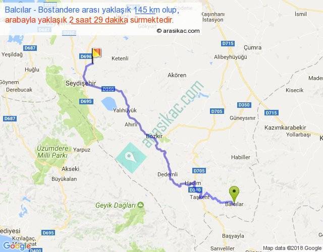 Balcılar - Bostandere arası yaklaşık olarak 90 km/h ile yukarıda belirtilen sürede olup, iki yerin kuş uçuşu uzaklığı (mesafesi) 96'dir. Yolculuk otobüsle 3 saat 13 dakika sürmektedir.