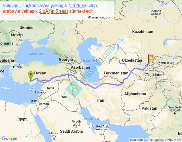 Balcılar - Taşkent arası yaklaşık olarak 90 km/h ile yukarıda belirtilen sürede olup, iki yerin kuş uçuşu uzaklığı (mesafesi) 3150'dir. Eğer belirtilen yerler arasında uçak seferi var ise bu süre uçakla 4 saat 50 dakika'ya kadar düşebilir. Yolculuk otobüsle 2 gün 20 saat sürmektedir.