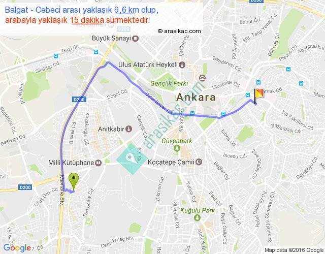 Balgat - Cebeci arası yaklaşık olarak 90 km/h ile yukarıda belirtilen sürede olup, iki yerin kuş uçuşu uzaklığı (mesafesi) 6'dir. Yolculuk otobüsle 19 dakika sürmektedir.