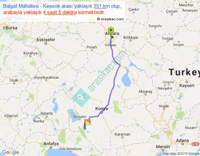 Balgat Mahallesi - Kesecik arası yaklaşık olarak 90 km/h ile yukarıda belirtilen sürede olup, iki yerin kuş uçuşu uzaklığı (mesafesi) 285'dir. Eğer belirtilen yerler arasında uçak seferi var ise bu süre uçakla 26 dakika'ya kadar düşebilir. Yolculuk otobüsle 5 saat 18 dakika sürmektedir.