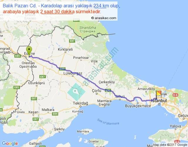 Balık Pazarı Cd. - Karadolap arası yaklaşık olarak 90 km/h ile yukarıda belirtilen sürede olup, iki yerin kuş uçuşu uzaklığı (mesafesi) 208'dir. Yolculuk otobüsle 3 saat 15 dakika sürmektedir.