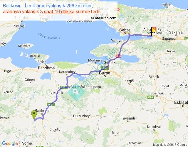 Balıkesir - İzmit arası yaklaşık olarak 90 km/h ile yukarıda belirtilen sürede olup, iki yerin kuş uçuşu uzaklığı (mesafesi) 229'dir. Yolculuk otobüsle 4 saat 14 dakika sürmektedir.