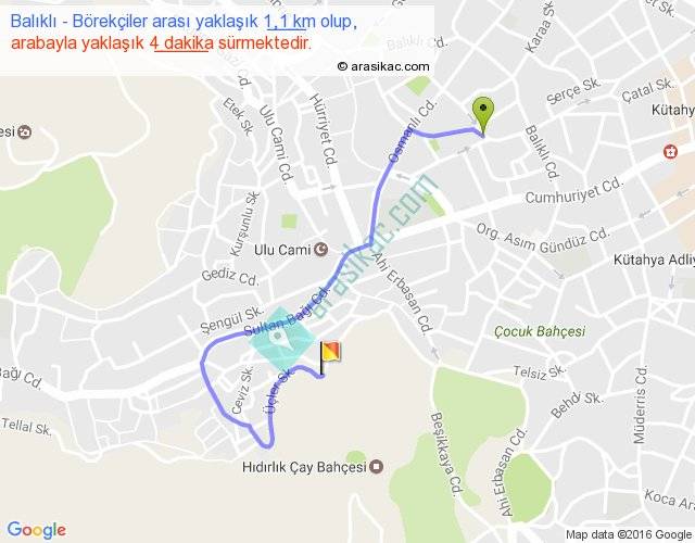 Balıklı - Börekçiler arası yaklaşık olarak 90 km/h ile yukarıda belirtilen sürede olup, iki yerin kuş uçuşu uzaklığı (mesafesi) 0'dir. Yolculuk otobüsle 5 dakika sürmektedir.