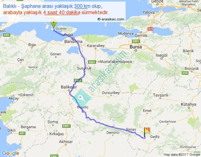 Balıklı - Şaphane arası yaklaşık olarak 90 km/h ile yukarıda belirtilen sürede olup, iki yerin kuş uçuşu uzaklığı (mesafesi) 209'dir. Yolculuk otobüsle 6 saat 4 dakika sürmektedir.