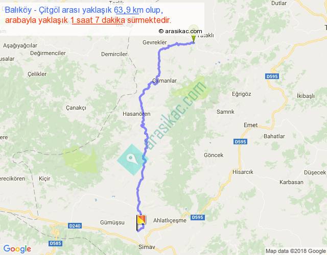 Balıköy - Çitgöl arası yaklaşık olarak 90 km/h ile yukarıda belirtilen sürede olup, iki yerin kuş uçuşu uzaklığı (mesafesi) 45'dir. Yolculuk otobüsle 1 saat 27 dakika sürmektedir.