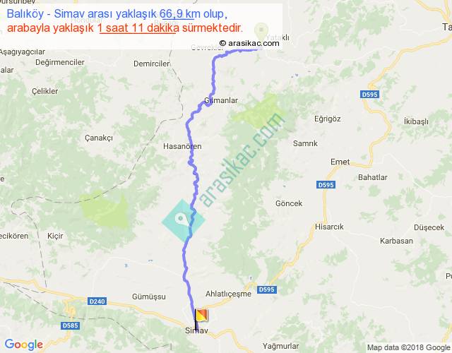 Balıköy - Simav arası yaklaşık olarak 90 km/h ile yukarıda belirtilen sürede olup, iki yerin kuş uçuşu uzaklığı (mesafesi) 48'dir. Yolculuk otobüsle 1 saat 32 dakika sürmektedir.