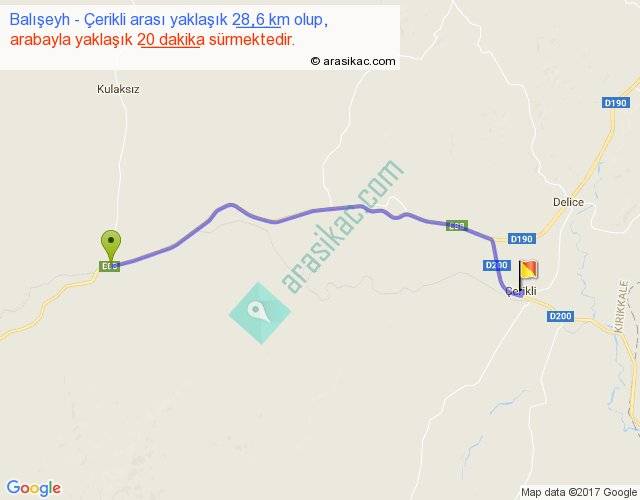 Balışeyh - Çerikli arası yaklaşık olarak 90 km/h ile yukarıda belirtilen sürede olup, iki yerin kuş uçuşu uzaklığı (mesafesi) 24'dir. Yolculuk otobüsle 26 dakika sürmektedir.