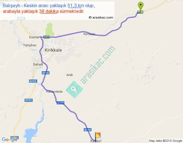 Balışeyh - Keskin arası yaklaşık olarak 90 km/h ile yukarıda belirtilen sürede olup, iki yerin kuş uçuşu uzaklığı (mesafesi) 28'dir. Yolculuk otobüsle 49 dakika sürmektedir.