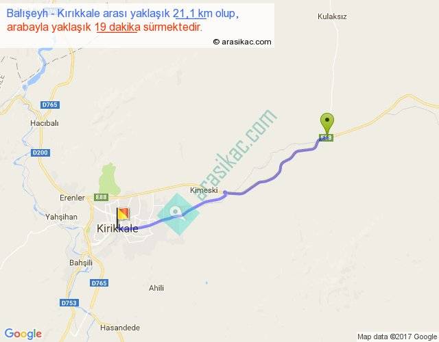 Balışeyh - Kırıkkale arası yaklaşık olarak 90 km/h ile yukarıda belirtilen sürede olup, iki yerin kuş uçuşu uzaklığı (mesafesi) 19'dir. Yolculuk otobüsle 23 dakika sürmektedir.