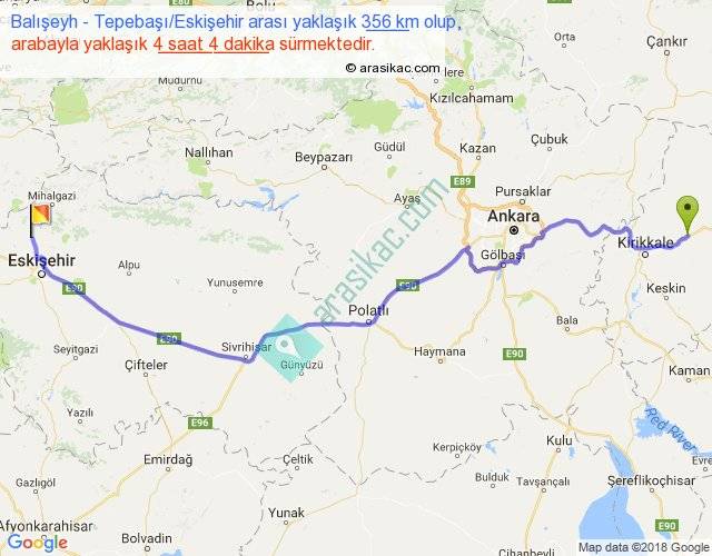 Balışeyh - Tepebaşı Eskişehir arası yaklaşık olarak 90 km/h ile yukarıda belirtilen sürede olup, iki yerin kuş uçuşu uzaklığı (mesafesi) 275'dir. Eğer belirtilen yerler arasında uçak seferi var ise bu süre uçakla 25 dakika'ya kadar düşebilir. Yolculuk otobüsle 5 saat 17 dakika sürmektedir.