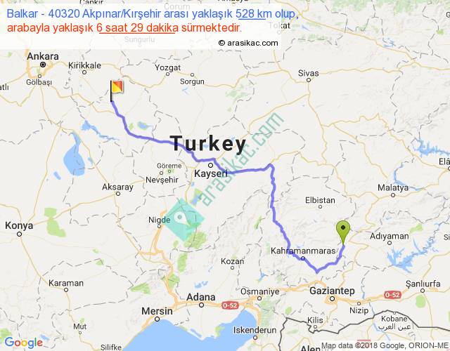 Balkar - 40320 Akpınar Kırşehir arası yaklaşık olarak 90 km/h ile yukarıda belirtilen sürede olup, iki yerin kuş uçuşu uzaklığı (mesafesi) 369'dir. Eğer belirtilen yerler arasında uçak seferi var ise bu süre uçakla 34 dakika'ya kadar düşebilir. Yolculuk otobüsle 8 saat 25 dakika sürmektedir.