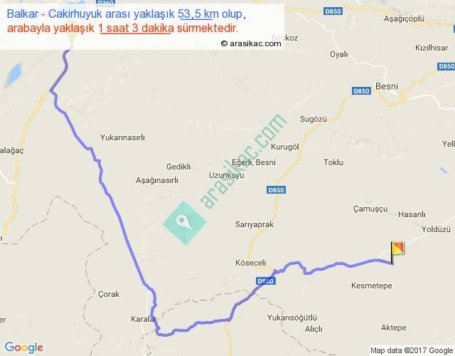 Balkar - Cakirhuyuk arası yaklaşık olarak 90 km/h ile yukarıda belirtilen sürede olup, iki yerin kuş uçuşu uzaklığı (mesafesi) 33'dir. Yolculuk otobüsle 1 saat 21 dakika sürmektedir.