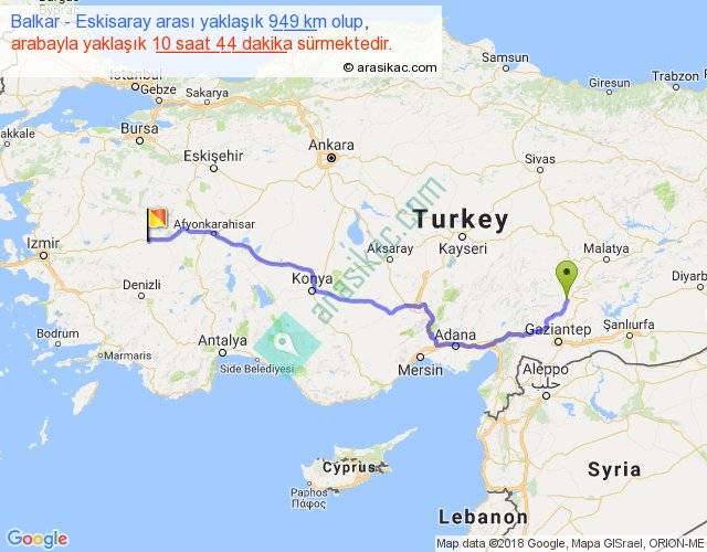 Balkar - Eskisaray arası yaklaşık olarak 90 km/h ile yukarıda belirtilen sürede olup, iki yerin kuş uçuşu uzaklığı (mesafesi) 730'dir. Eğer belirtilen yerler arasında uçak seferi var ise bu süre uçakla 1 saat 07 dakika'ya kadar düşebilir. Yolculuk otobüsle 13 saat 57 dakika sürmektedir.