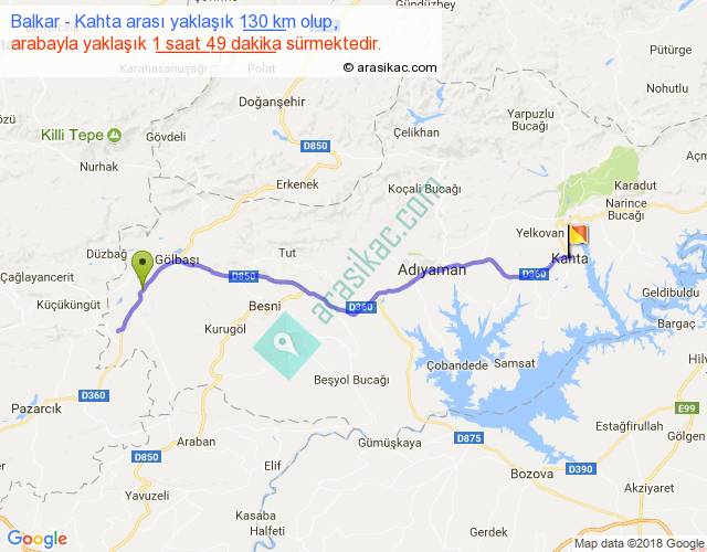 Balkar - Kahta arası yaklaşık olarak 90 km/h ile yukarıda belirtilen sürede olup, iki yerin kuş uçuşu uzaklığı (mesafesi) 93'dir. Yolculuk otobüsle 2 saat 21 dakika sürmektedir.