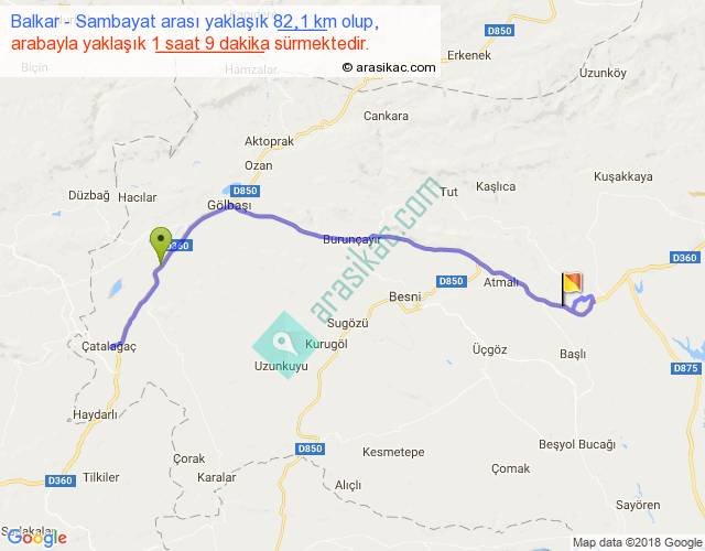 Balkar - Sambayat arası yaklaşık olarak 90 km/h ile yukarıda belirtilen sürede olup, iki yerin kuş uçuşu uzaklığı (mesafesi) 44'dir. Yolculuk otobüsle 1 saat 29 dakika sürmektedir.