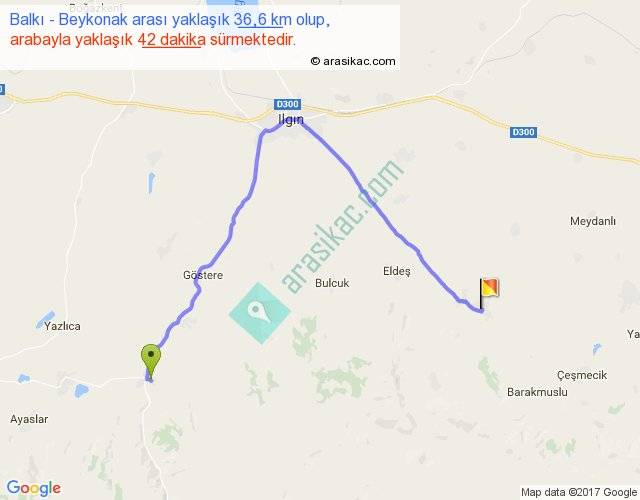 Balkı - Beykonak arası yaklaşık olarak 90 km/h ile yukarıda belirtilen sürede olup, iki yerin kuş uçuşu uzaklığı (mesafesi) 20'dir. Yolculuk otobüsle 54 dakika sürmektedir.
