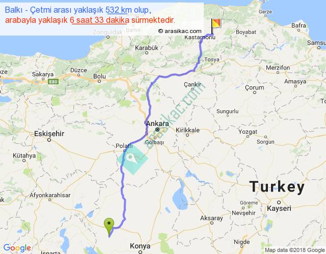 Balkı - Çetmi arası yaklaşık olarak 90 km/h ile yukarıda belirtilen sürede olup, iki yerin kuş uçuşu uzaklığı (mesafesi) 417'dir. Eğer belirtilen yerler arasında uçak seferi var ise bu süre uçakla 38 dakika'ya kadar düşebilir. Yolculuk otobüsle 8 saat 30 dakika sürmektedir.