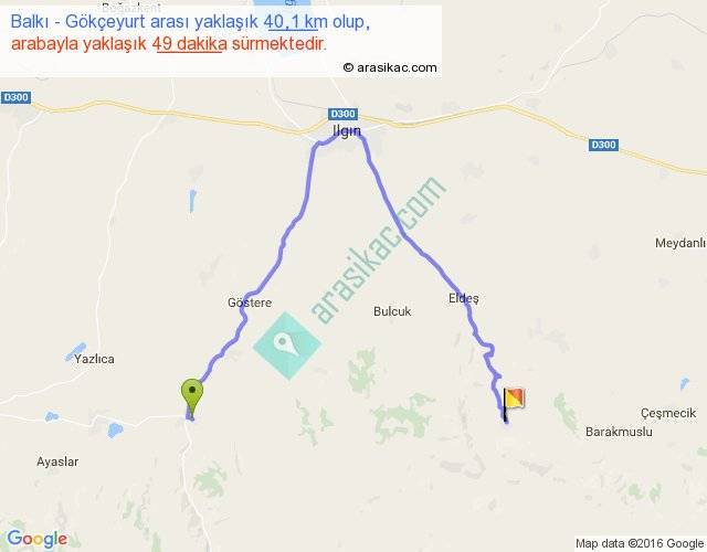 Balkı - Gökçeyurt arası yaklaşık olarak 90 km/h ile yukarıda belirtilen sürede olup, iki yerin kuş uçuşu uzaklığı (mesafesi) 17'dir. Yolculuk otobüsle 1 saat 3 dakika sürmektedir.
