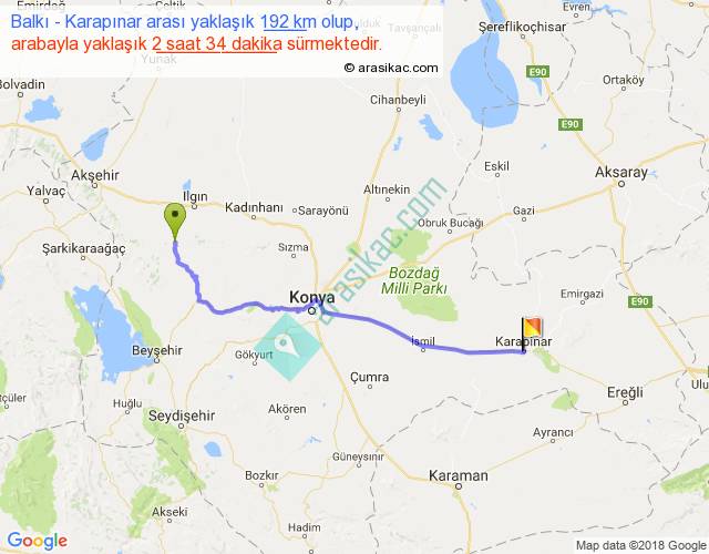 Balkı - Karapınar arası yaklaşık olarak 90 km/h ile yukarıda belirtilen sürede olup, iki yerin kuş uçuşu uzaklığı (mesafesi) 158'dir. Yolculuk otobüsle 3 saat 20 dakika sürmektedir.