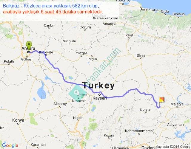 Balkiraz - Kozluca arası yaklaşık olarak 90 km/h ile yukarıda belirtilen sürede olup, iki yerin kuş uçuşu uzaklığı (mesafesi) 445'dir. Eğer belirtilen yerler arasında uçak seferi var ise bu süre uçakla 41 dakika'ya kadar düşebilir. Yolculuk otobüsle 8 saat 46 dakika sürmektedir.