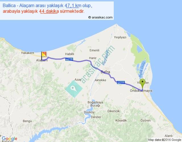 Ballica - Alaçam arası yaklaşık olarak 90 km/h ile yukarıda belirtilen sürede olup, iki yerin kuş uçuşu uzaklığı (mesafesi) 42'dir. Yolculuk otobüsle 57 dakika sürmektedir.