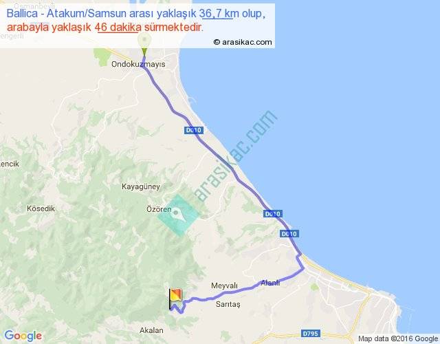 Ballica - Atakum Samsun arası yaklaşık olarak 90 km/h ile yukarıda belirtilen sürede olup, iki yerin kuş uçuşu uzaklığı (mesafesi) 21'dir. Yolculuk otobüsle 59 dakika sürmektedir.