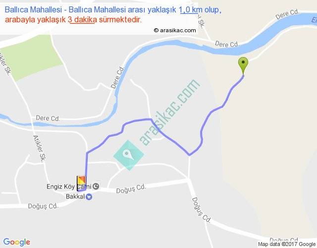 Ballıca Mahallesi - Ballıca Mahallesi arası yaklaşık olarak 90 km/h ile yukarıda belirtilen sürede olup, iki yerin kuş uçuşu uzaklığı (mesafesi) 1'dir. Yolculuk otobüsle 3 dakika sürmektedir.