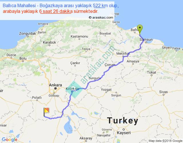 Ballıca Mahallesi - Boğazkaya arası yaklaşık olarak 90 km/h ile yukarıda belirtilen sürede olup, iki yerin kuş uçuşu uzaklığı (mesafesi) 407'dir. Eğer belirtilen yerler arasında uçak seferi var ise bu süre uçakla 37 dakika'ya kadar düşebilir. Yolculuk otobüsle 8 saat 21 dakika sürmektedir.