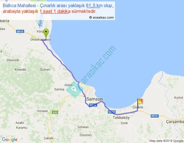 Ballıca Mahallesi - Çınarlık arası yaklaşık olarak 90 km/h ile yukarıda belirtilen sürede olup, iki yerin kuş uçuşu uzaklığı (mesafesi) 45'dir. Yolculuk otobüsle 1 saat 19 dakika sürmektedir.