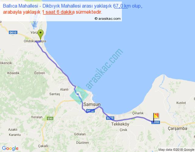 Ballıca Mahallesi - Dikbıyık Mahallesi arası yaklaşık olarak 90 km/h ile yukarıda belirtilen sürede olup, iki yerin kuş uçuşu uzaklığı (mesafesi) 52'dir. Yolculuk otobüsle 1 saat 25 dakika sürmektedir.