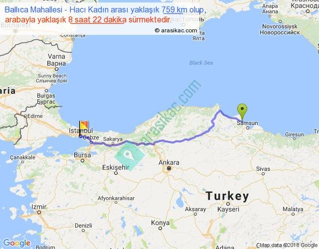 Ballıca Mahallesi - Hacı Kadın arası yaklaşık olarak 90 km/h ile yukarıda belirtilen sürede olup, iki yerin kuş uçuşu uzaklığı (mesafesi) 596'dir. Eğer belirtilen yerler arasında uçak seferi var ise bu süre uçakla 55 dakika'ya kadar düşebilir. Yolculuk otobüsle 10 saat 52 dakika sürmektedir.