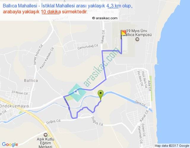 Ballıca Mahallesi - İstiklal Mahallesi arası yaklaşık olarak 90 km/h ile yukarıda belirtilen sürede olup, iki yerin kuş uçuşu uzaklığı (mesafesi) 2'dir. Yolculuk otobüsle 13 dakika sürmektedir.