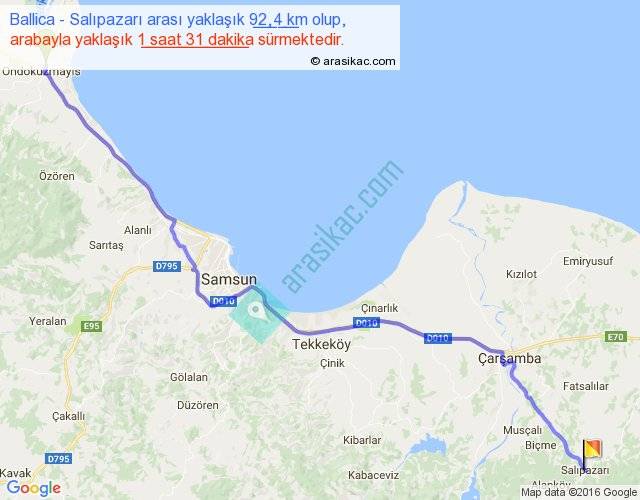 Ballica - Salıpazarı arası yaklaşık olarak 90 km/h ile yukarıda belirtilen sürede olup, iki yerin kuş uçuşu uzaklığı (mesafesi) 77'dir. Yolculuk otobüsle 1 saat 58 dakika sürmektedir.