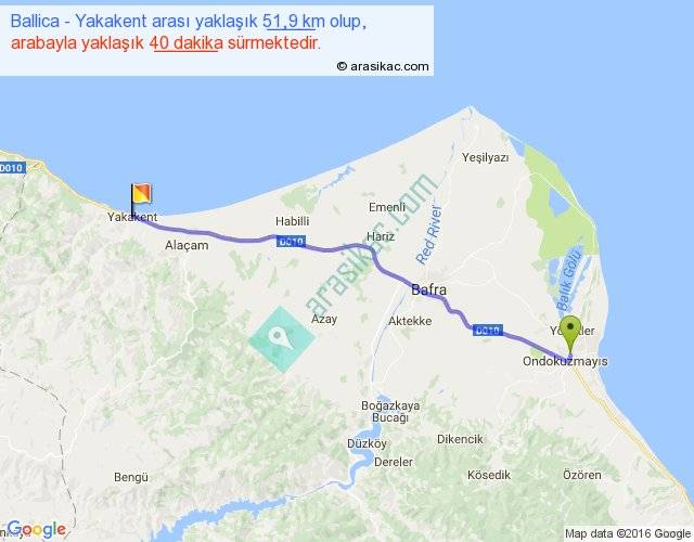 Ballica - Yakakent arası yaklaşık olarak 90 km/h ile yukarıda belirtilen sürede olup, iki yerin kuş uçuşu uzaklığı (mesafesi) 48'dir. Yolculuk otobüsle 52 dakika sürmektedir.