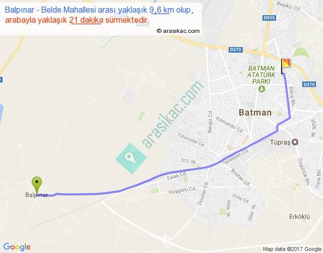 Balpınar - Belde Mahallesi arası yaklaşık olarak 90 km/h ile yukarıda belirtilen sürede olup, iki yerin kuş uçuşu uzaklığı (mesafesi) 8'dir. Yolculuk otobüsle 27 dakika sürmektedir.