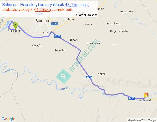 Balpınar - Hasankeyf arası yaklaşık olarak 90 km/h ile yukarıda belirtilen sürede olup, iki yerin kuş uçuşu uzaklığı (mesafesi) 36'dir. Yolculuk otobüsle 57 dakika sürmektedir.