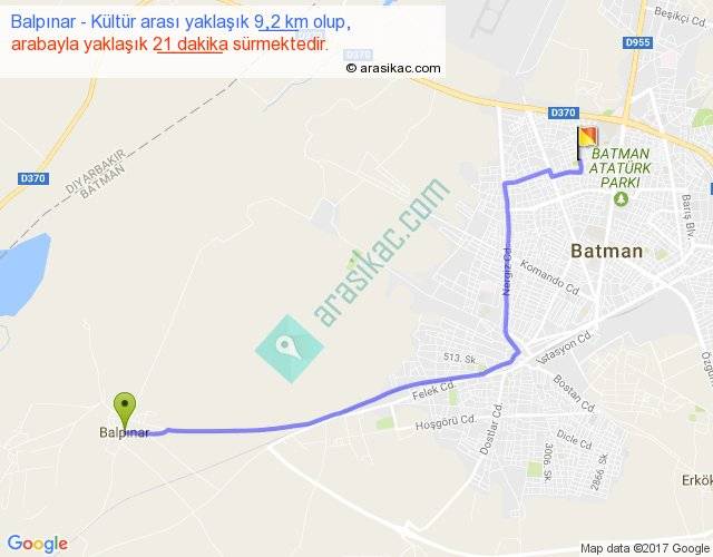 Balpınar - Kültür arası yaklaşık olarak 90 km/h ile yukarıda belirtilen sürede olup, iki yerin kuş uçuşu uzaklığı (mesafesi) 7'dir. Yolculuk otobüsle 27 dakika sürmektedir.