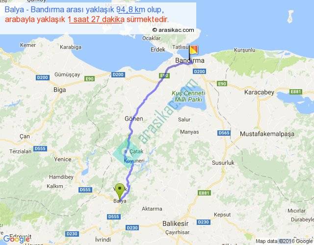 Balya - Bandırma arası yaklaşık olarak 90 km/h ile yukarıda belirtilen sürede olup, iki yerin kuş uçuşu uzaklığı (mesafesi) 75'dir. Yolculuk otobüsle 1 saat 53 dakika sürmektedir.
