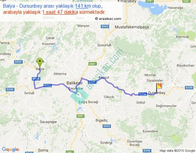 Balya - Dursunbey arası yaklaşık olarak 90 km/h ile yukarıda belirtilen sürede olup, iki yerin kuş uçuşu uzaklığı (mesafesi) 91'dir. Yolculuk otobüsle 2 saat 19 dakika sürmektedir.