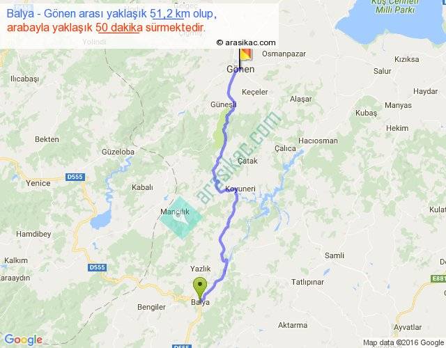Balya - Gönen arası yaklaşık olarak 90 km/h ile yukarıda belirtilen sürede olup, iki yerin kuş uçuşu uzaklığı (mesafesi) 40'dir. Yolculuk otobüsle 1 saat 5 dakika sürmektedir.