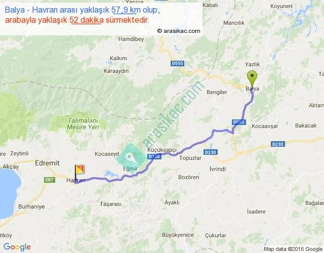 Balya - Havran arası yaklaşık olarak 90 km/h ile yukarıda belirtilen sürede olup, iki yerin kuş uçuşu uzaklığı (mesafesi) 46'dir. Yolculuk otobüsle 1 saat 7 dakika sürmektedir.