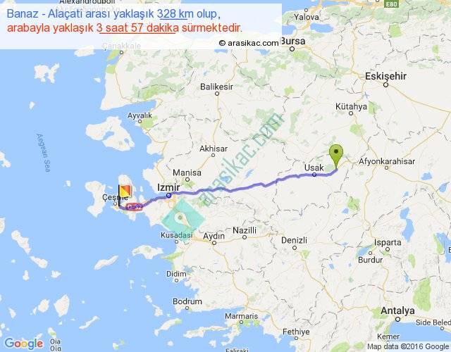 Banaz - Alaçati arası yaklaşık olarak 90 km/h ile yukarıda belirtilen sürede olup, iki yerin kuş uçuşu uzaklığı (mesafesi) 296'dir. Eğer belirtilen yerler arasında uçak seferi var ise bu süre uçakla 27 dakika'ya kadar düşebilir. Yolculuk otobüsle 5 saat 8 dakika sürmektedir.