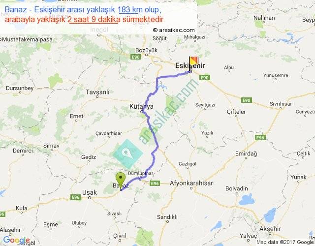 Banaz - Eskişehir arası yaklaşık olarak 90 km/h ile yukarıda belirtilen sürede olup, iki yerin kuş uçuşu uzaklığı (mesafesi) 131'dir. Yolculuk otobüsle 2 saat 47 dakika sürmektedir.
