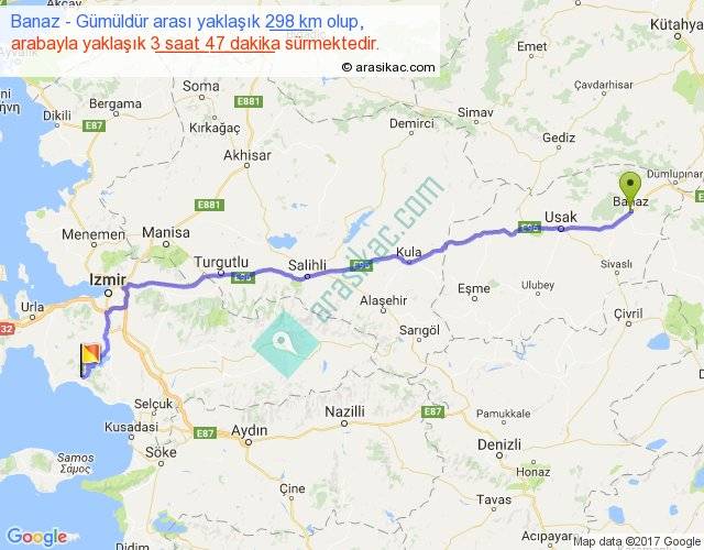 Banaz - Gümüldür arası yaklaşık olarak 90 km/h ile yukarıda belirtilen sürede olup, iki yerin kuş uçuşu uzaklığı (mesafesi) 248'dir. Yolculuk otobüsle 4 saat 55 dakika sürmektedir.