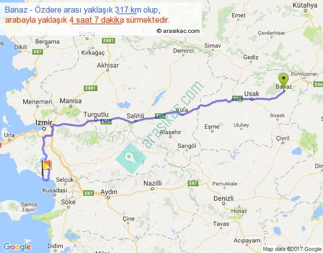 Banaz - Özdere arası yaklaşık olarak 90 km/h ile yukarıda belirtilen sürede olup, iki yerin kuş uçuşu uzaklığı (mesafesi) 241'dir. Yolculuk otobüsle 5 saat 21 dakika sürmektedir.