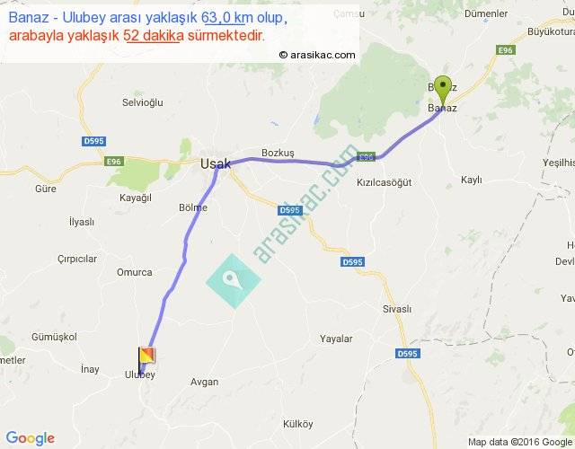 Banaz - Ulubey arası yaklaşık olarak 90 km/h ile yukarıda belirtilen sürede olup, iki yerin kuş uçuşu uzaklığı (mesafesi) 53'dir. Yolculuk otobüsle 1 saat 7 dakika sürmektedir.