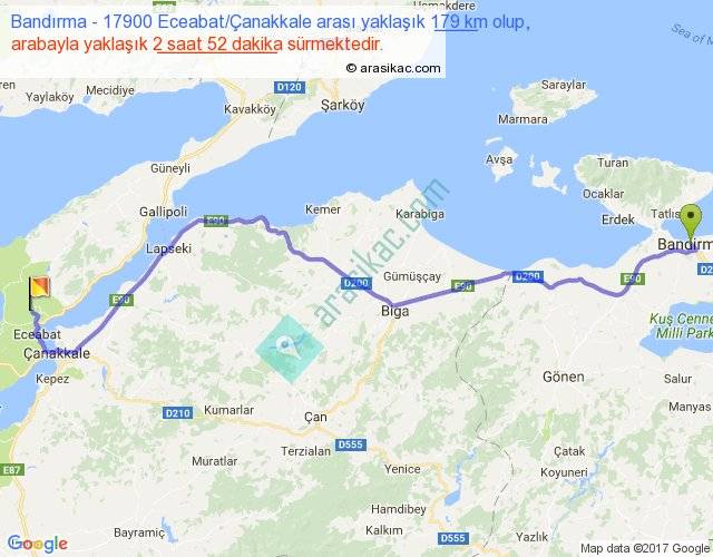 Bandırma - 17900 Eceabat Çanakkale arası yaklaşık olarak 90 km/h ile yukarıda belirtilen sürede olup, iki yerin kuş uçuşu uzaklığı (mesafesi) 138'dir. Yolculuk otobüsle 3 saat 43 dakika sürmektedir.