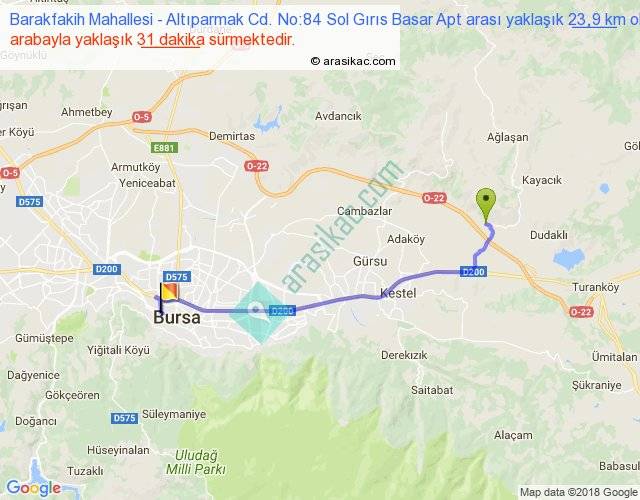 Barakfakih Mahallesi - Altıparmak Cd. No:84 Sol Gırıs Basar Apt arası yaklaşık olarak 90 km/h ile yukarıda belirtilen sürede olup, iki yerin kuş uçuşu uzaklığı (mesafesi) 19'dir. Yolculuk otobüsle 40 dakika sürmektedir.