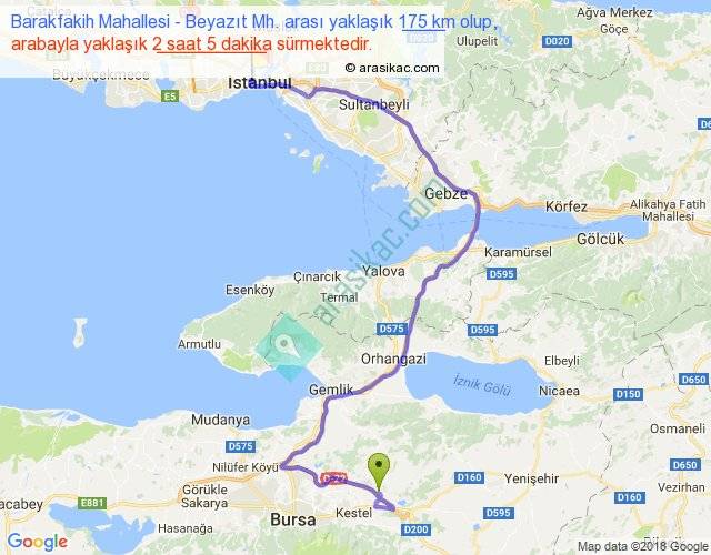 Barakfakih Mahallesi - Beyazıt Mh. arası yaklaşık olarak 90 km/h ile yukarıda belirtilen sürede olup, iki yerin kuş uçuşu uzaklığı (mesafesi) 89'dir. Yolculuk otobüsle 2 saat 42 dakika sürmektedir.