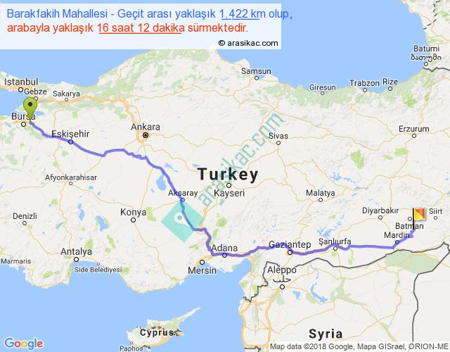 Barakfakih Mahallesi - Geçit arası yaklaşık olarak 90 km/h ile yukarıda belirtilen sürede olup, iki yerin kuş uçuşu uzaklığı (mesafesi) 1069'dir. Eğer belirtilen yerler arasında uçak seferi var ise bu süre uçakla 1 saat 38 dakika'ya kadar düşebilir. Yolculuk otobüsle 21 saat 3 dakika sürmektedir.